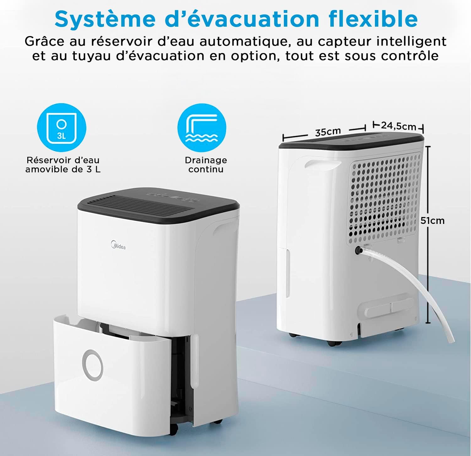 Oui, selon l’humidité ambiante et la capacité du réservoir (généralement 2-3L). Les modèles Midea proposent deux options : vidage manuel ou tuyau de drainage continu (plus pratique pour utilisation 24/24). Vérifiez tous les 2-3 jours.