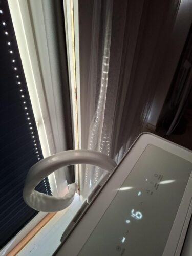 Leider rastet es erst sehr weit ausen auf dem Gestell ein. Dazu ist der Anschluss oben und nicht hinten. Was viel Weg bei meinem Ultraengen Dachgaubenfenster frisst.