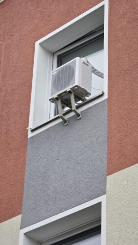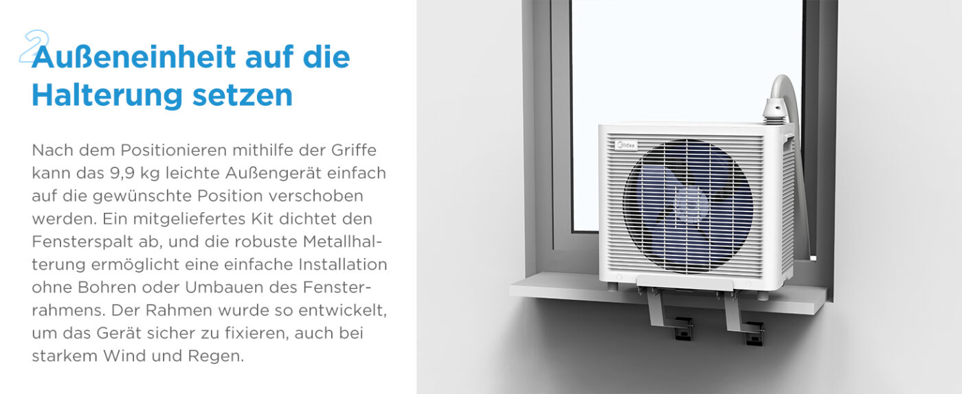 Ja, in 3 Schritten und 10 Minuten: Befestigen Sie die Halterung am Fenster, setzen Sie das Außengerät (nur 9,9 kg) auf und starten Sie. Kein Bohren, keine permanenten Änderungen, kein Fachmann erforderlich. Das Fenster-Kit passt sich verschiedenen Größen an.