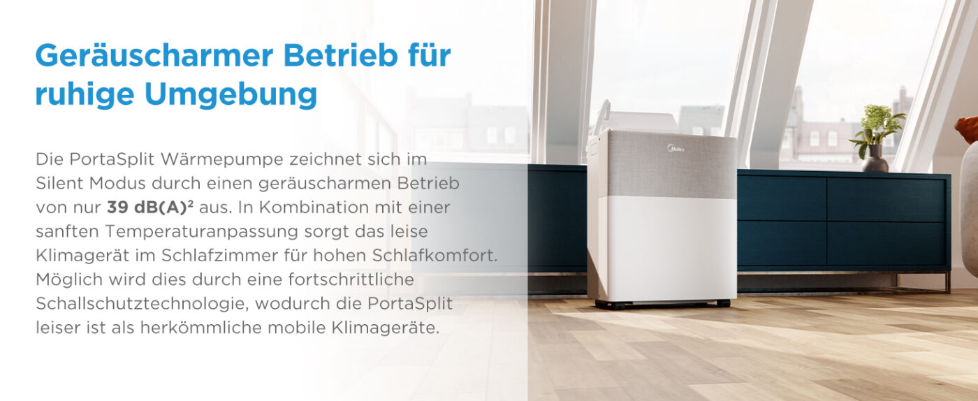 Der Portasplit arbeitet mit 39 dB, vergleichbar mit einer ruhigen Bibliothek. Das ist deutlich leiser als herkömmliche mobile Klimageräte (55-65 dB). Die Geräuschreduzierungstechnologie garantiert eine kühle Umgebung ohne Lärmbelästigung.