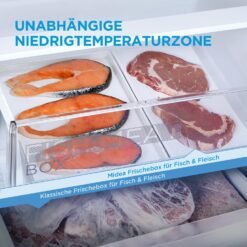 Die unabhängige Niedrigtemperaturzone ist geeignet für die Lagerung von Fleisch und Fisch innerhalb von 2-3 Tagen. Fleisch muss nicht aufgetaut werden und kann leicht geschnitten werden – perfekt für spontanes Kochen!
