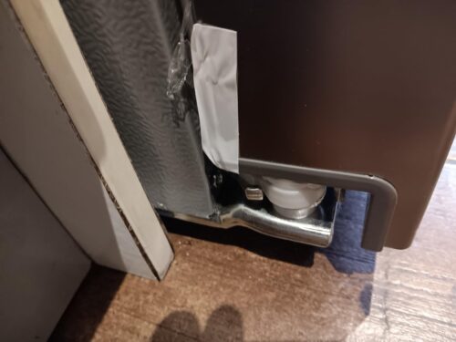 Daher mussten wir den Kühlschrank selbst transportieren. Dazu haben wir ihn ausgepackt, Türen abgeschraubt und die Halterungen für die Türen unten, ebenfalls abmontiert.