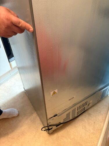 Was ein Glück, aber , nach dem Auspacken leider getrübt durch die Tatsache, dass der Kühlschrank an der linken Seite, mittig und durchgehend in ganzer Länge, eine Beule hat. Irgendwas drückt offenbar von innen des Gerätes.Alles sieht sehr symmetrisch aus , was die beiden Herren veranlasste mir zu erklären, das müsste so sein.
