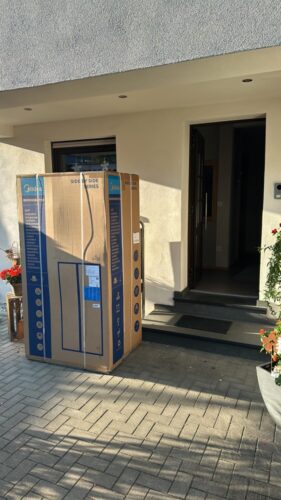 Anlieferung hat super geklappt, die Beiden Fahrer hätten das Gerät auch bis zum Aufstellort getragen, allerdings war dieser im 1. Stock und mit Verpackung nicht zu bewältigen.