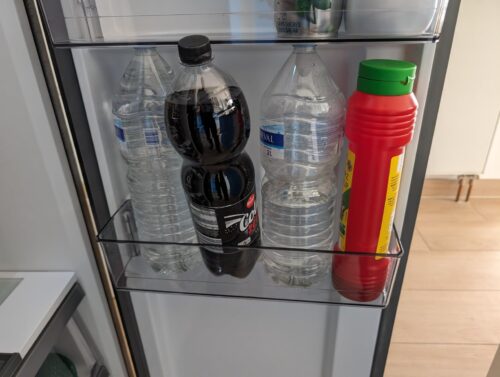 Door shelves are too low for drinking bottles - like for water or for soda. Ideally a few centimeters extra would have been nice. Normal size water or soda bottles from Aldi Germany and Belgium are just a bit too tall. If the two shelves above had been maybe 10-15mm shorter each, then it would likely fit. One can of course remove a shelf to make the bottles fit, so it's therefore not any worse than fridges with just 3 door shelves.