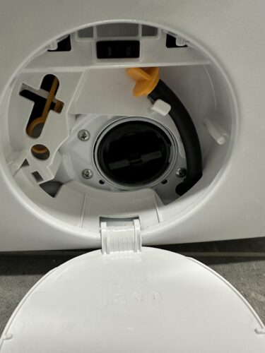 Nerviger wirds dann leider beim Flusensieb. Die Abdeckung davon öffnet nämlich unpraktischer weise nach unten statt z.B. zur Seite. Dadurch ist der Deckel dann im Weg, wenn man das Wasser ablässt. In Kombination mit dem viel zu kurzen Schlauch muss man schon aufpassen, dass man sich nicht versehentlich die Hand irgendwie auf dem Deckel abstützt oder abrutscht. Dieser ist aus Plastik und nur an einem kleinen Scharnier, ebenfalls aus Plastik, befestigt. Wenn man nicht aufpasst, bricht der Deckel schneller weg als man schauen kann. Sieht dann natürlich nicht mehr so schön aus.