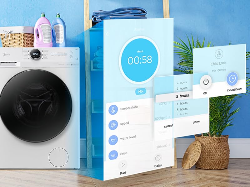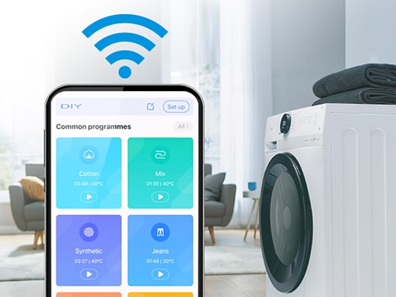 SMART HOME READY Steuern Sie Ihre Midea MF200W100WB bequem per Smartphone-App – von überall. Starten Sie Waschgänge unterwegs, überwachen Sie den Fortschritt und erhalten Sie Benachrichtigungen, wenn die Wäsche fertig ist.
