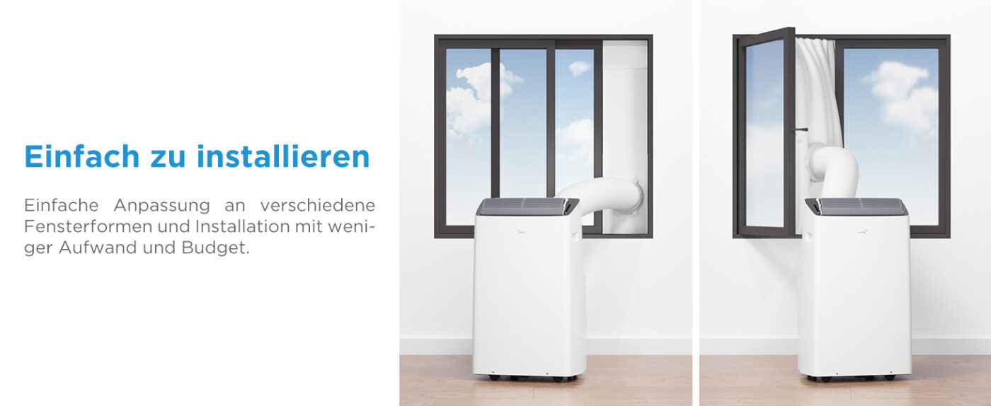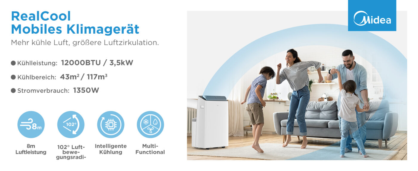 Das Midea Real Cool 35 repräsentiert die Spitzenklasse der mobilen Klimageräte mit einem SEER von 14.5 – einer der besten Werte auf dem Markt. Mit 12000 BTU Leistung und starkem Luftstrom für Räume bis 43 m² (117 m³). Inklusive App-Steuerung, Alexa und Google Home Kompatibilität.