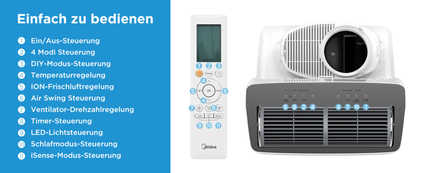 Laden Sie die Midea App (iOS/Android) herunter und verbinden Sie das Gerät über WLAN. Danach können Sie das Klimagerät von überall steuern, Zeitpläne erstellen und mit Alexa, Google Home oder IFTTT verknüpfen für Sprachsteuerung und Automatisierungen.