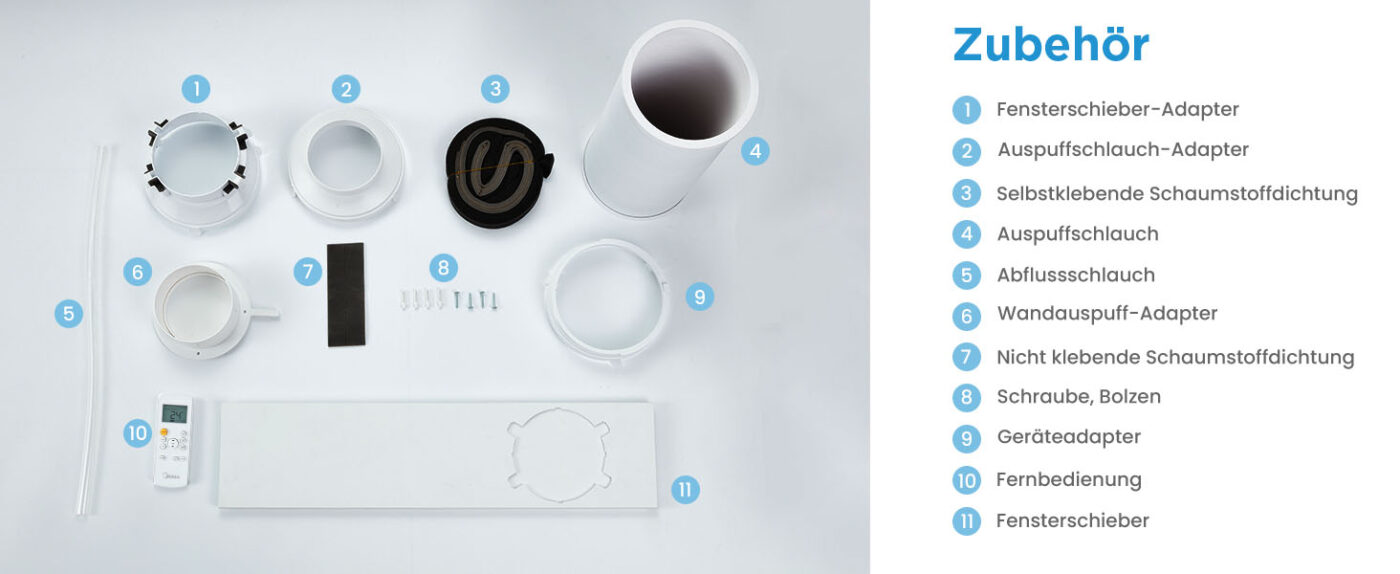 ✅ Abluftschlauch 150 cm | ✅ Fernbedienung mit Follow-Me | ✅ Fensterschieber + Schaumstoffdichtungen | ✅ Wanddurchbruchadapter