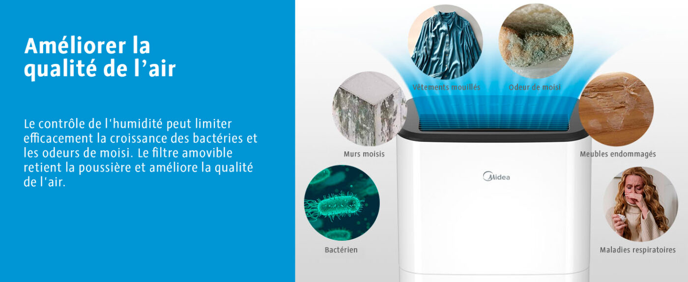 Le contrôle de l’humidité limite efficacement la croissance des bactéries. Le filtre amovible retient la poussière et améliore la qualité de l’air respiré.