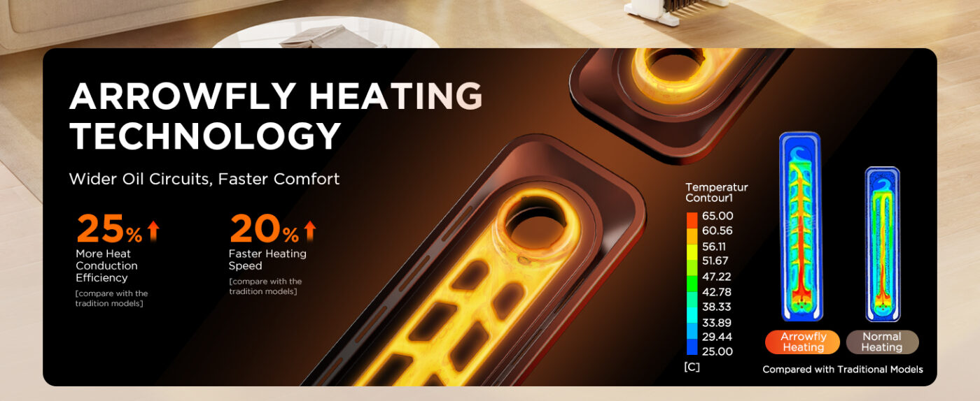 Arrowfly Heating Technology with fishbone-shaped oil circuit and 9 fins heating simultaneously delivers 20% faster warming than traditional models.