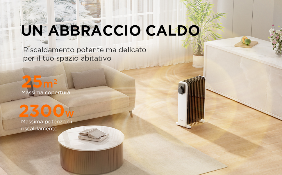 Assolutamente! Con 2300W di potenza e 11 alette, questo radiatore copre ambienti fino a 25m². La Tecnologia Arrowfly garantisce una distribuzione uniforme del calore in tutto lo spazio. Perfetto per soggiorni ampi, cucine open space o camere da letto spaziose.