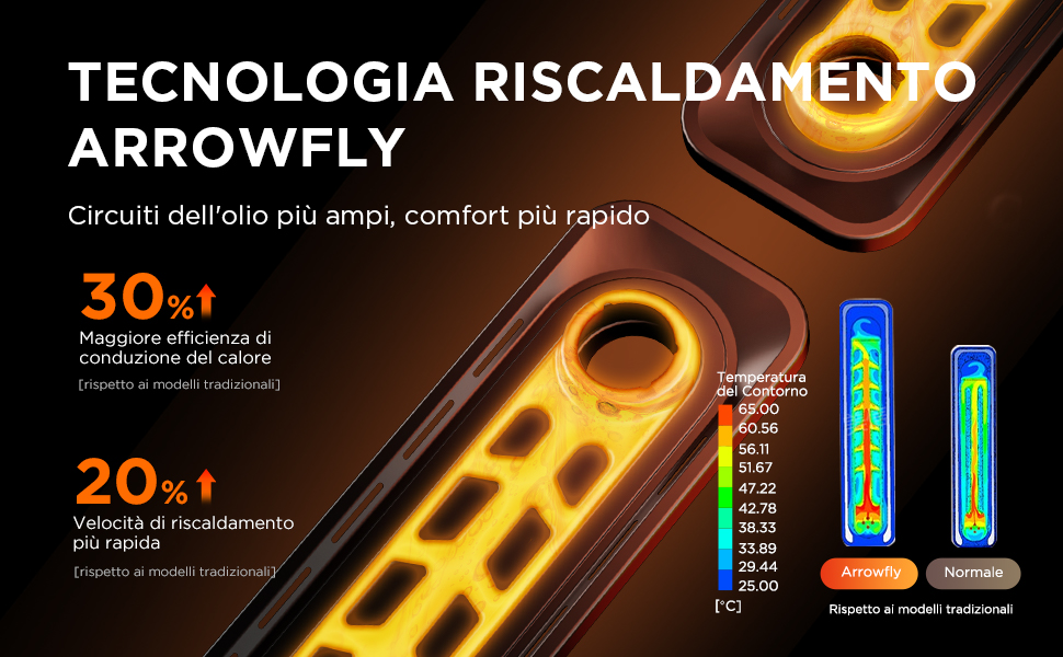 La tecnologia Arrowfly con circuito dell’olio a lisca di pesce e 11 alette che riscaldano simultaneamente garantisce un riscaldamento più veloce del 20% rispetto ai modelli tradizionali.