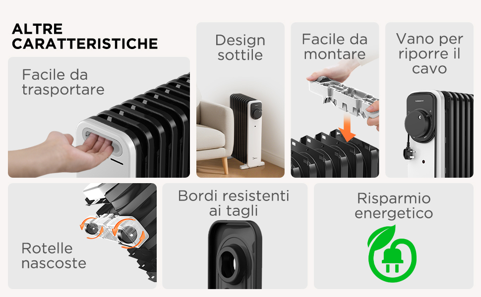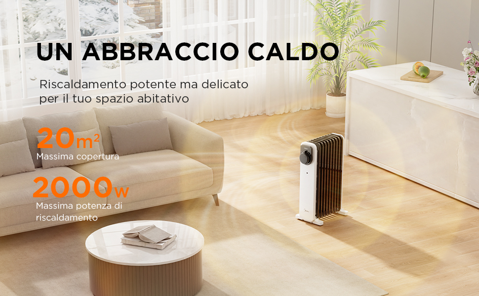 Il circuito dell’olio a forma di lisca di pesce permette alle 9 alette di riscaldare simultaneamente. Questa innovazione Midea garantisce una resa termica superiore e un riscaldamento ultra-rapido dell’ambiente.