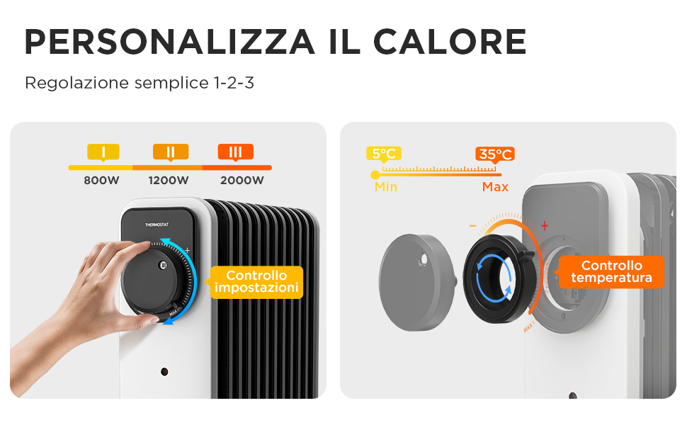 Il termoconvettore dispone di due manopole meccaniche: una per regolare il termostato (5-35°C) e una per selezionare la potenza (800W, 1200W o 2000W). Niente schermi né programmazioni complesse – solo un funzionamento intuitivo e affidabile che non si guasta mai.