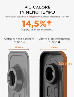 L’ailette en U de 154mm crée un puissant canal de convection par effet de stack. 14,5% de surface d’échange supplémentaire pour une chaleur homogène.