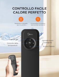 Chauffage électrique premium avec écran tactile LED et télécommande. Technologie Arrowfly pour une chaleur enveloppante à 360° dans toute la pièce.