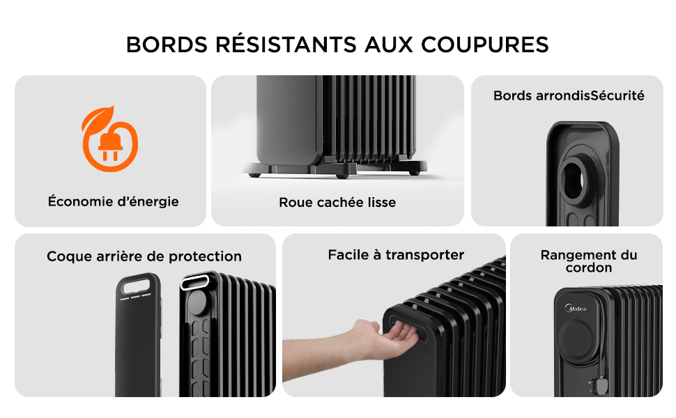 Roulettes pivotantes et poignée intégrée pour déplacer facilement le radiateur. Rangement câble intégré pour un espace ordonné.