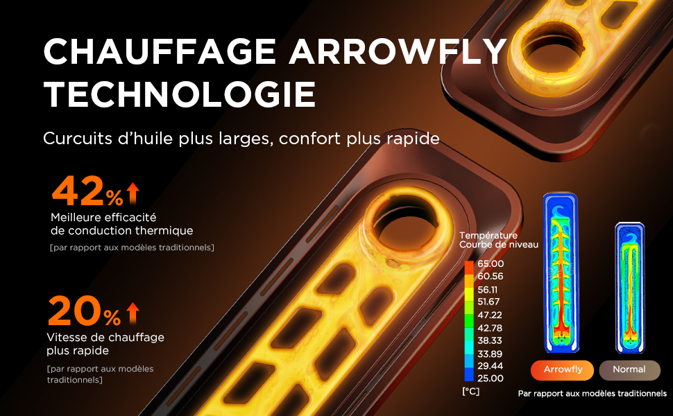 La technologie Arrowfly avec circuit en arête de poisson et les 11 ailettes élargies chauffent 20% plus vite que les radiateurs traditionnels.